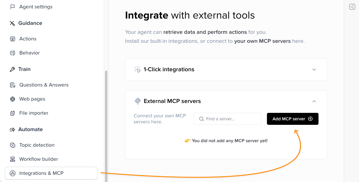 - Navigate to AI Agent > Integrations & MCP